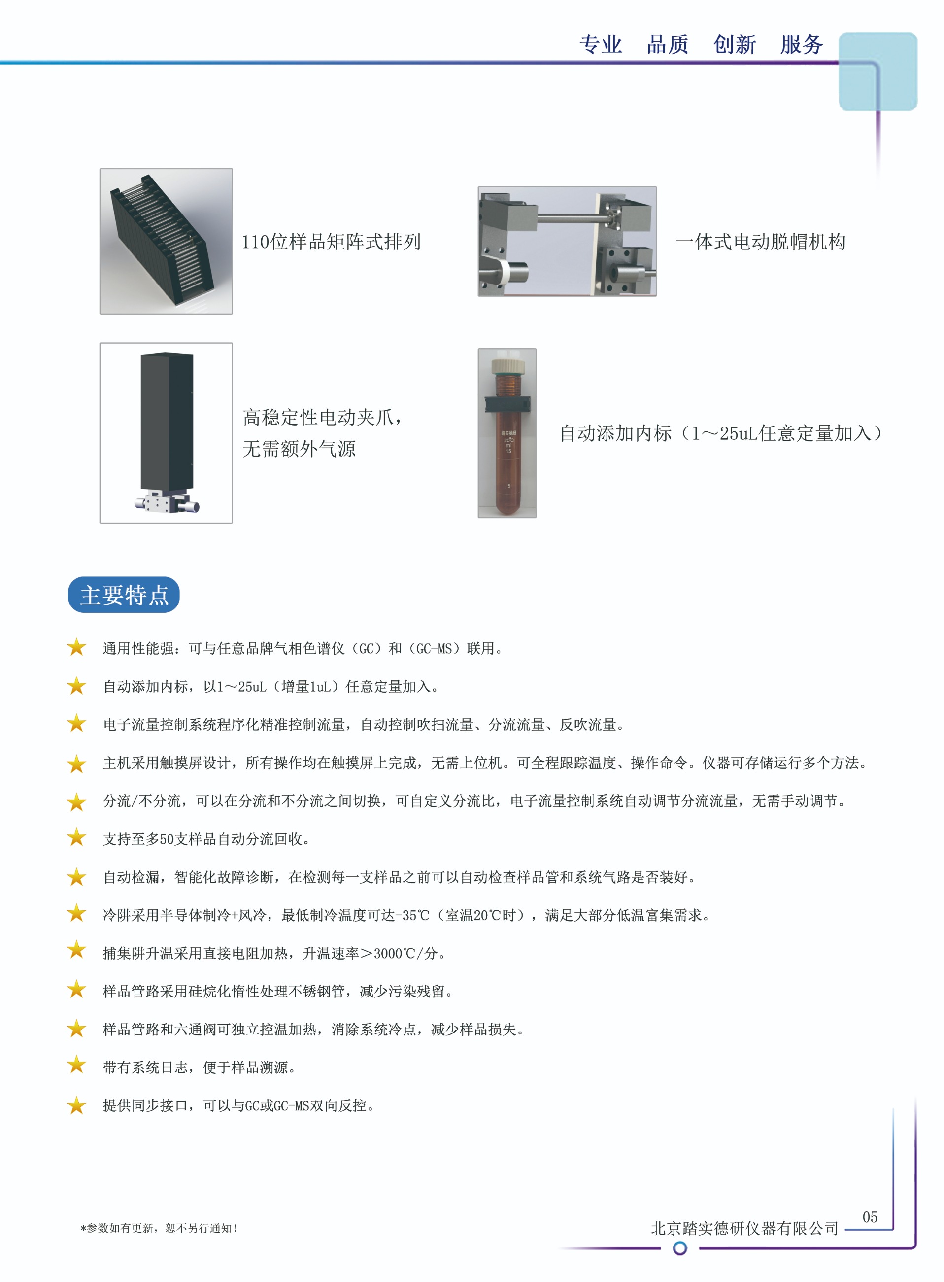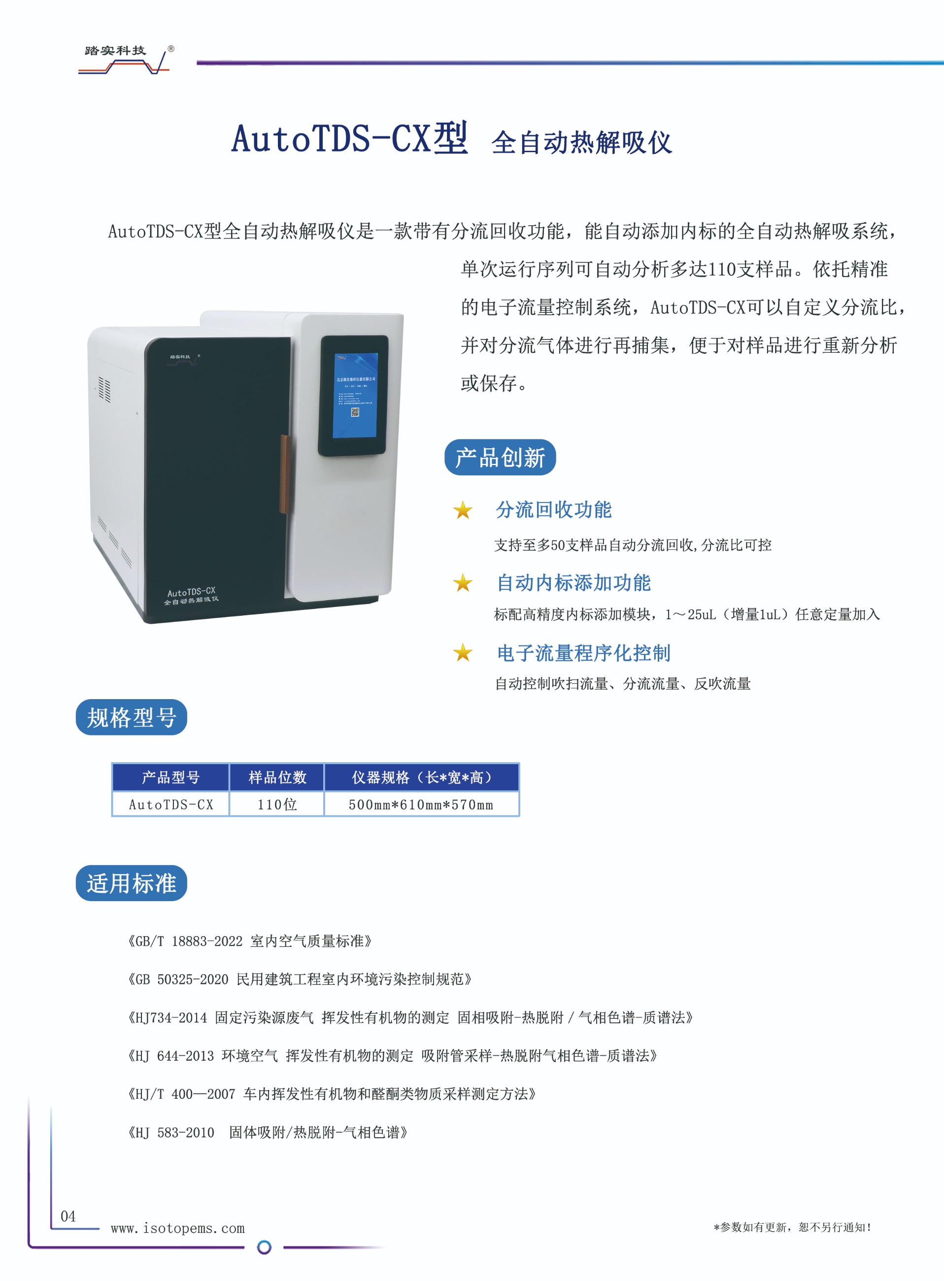 儀器簡介:AutoTDS-CX型全自動熱解吸儀是一款帶有分流回收功能,能自動添加內標的全自動熱解吸系統,單次運行序列可自動分析多達110支樣品。依托精準的電子流量控制系統,AutoTDS-CX可以自定義分流比,并對分流氣體進行再捕集,便于對樣品進行重新分析或保存。主要特點:l 通用性能強:可與任意品牌氣相色譜儀(GC)和(GC-MS)聯用。l * 自動添加內標,以1~25ul(增量1ul)任意