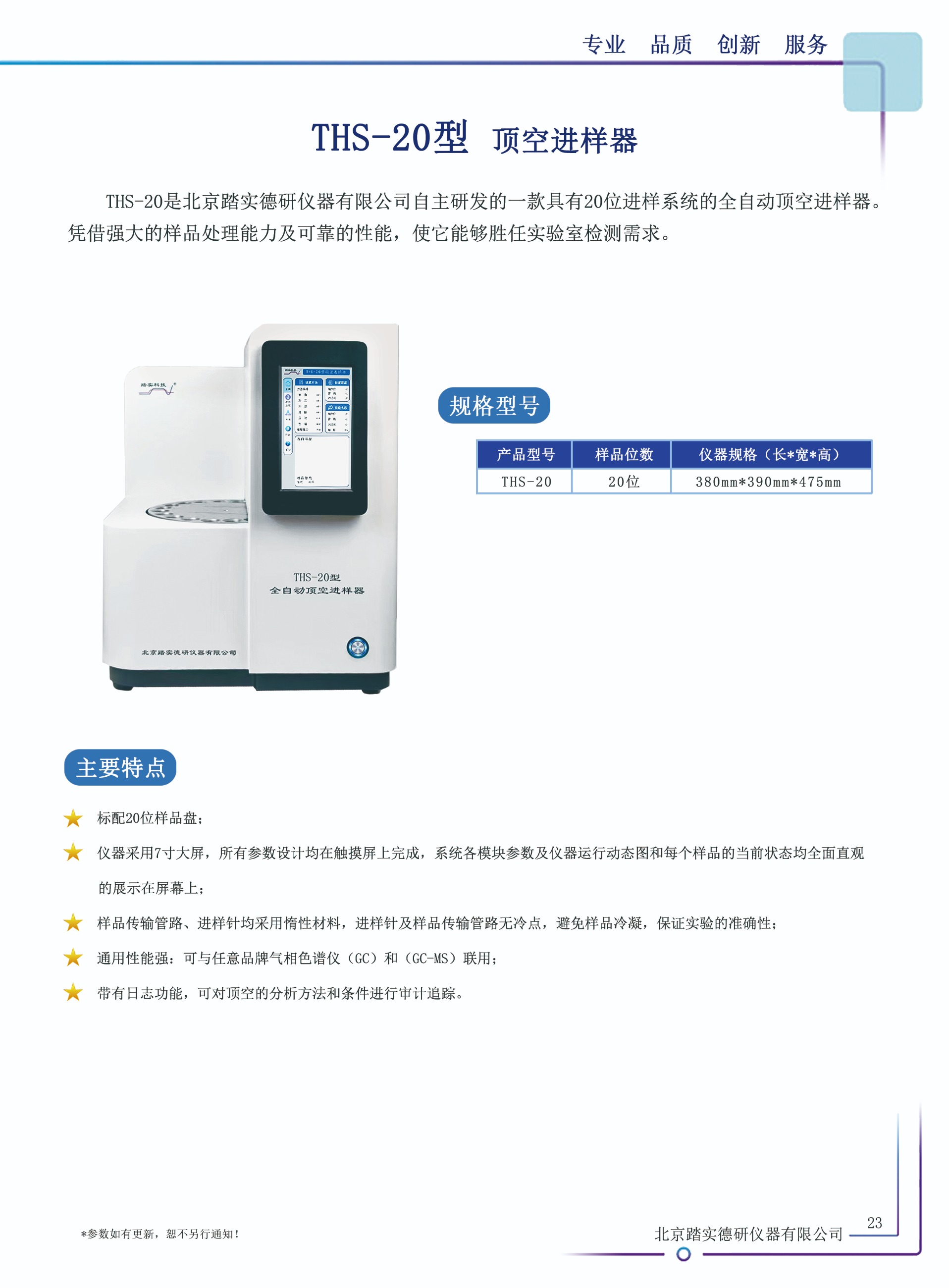 儀器特點:l 標配20位樣品盤; l 儀器采用7寸大屏,所有參數設計均在觸摸屏上完成,系統各模塊參數及儀器運行動態圖和每個樣品的當前狀態均全面直觀的展示在屏幕上;l 樣品傳輸管路、進樣針均采用惰性材料,進樣針及樣品傳輸管路無冷點,避免樣品冷凝,保證實驗的準確性;l 通用性能強:可與任意品牌氣相色譜儀(GC)和(GC-MS)聯用;l 帶有日志功能,可對頂空的分析方法和條件進行審計追蹤。